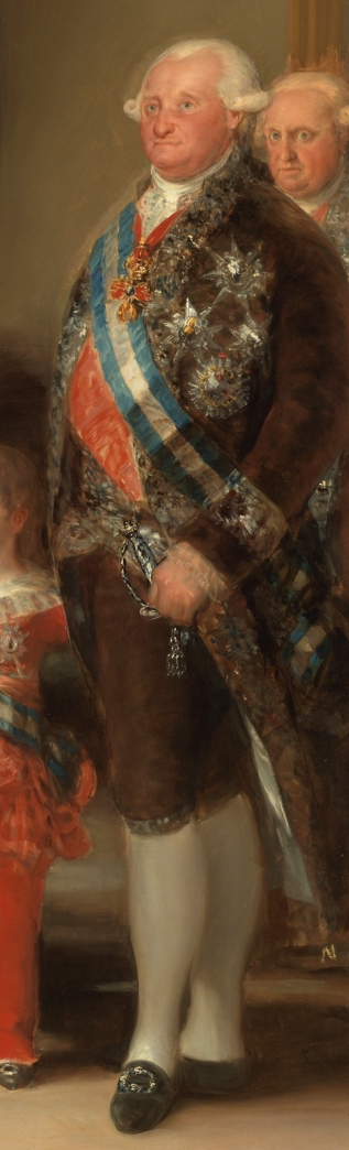 In posizione speculare alla regina troviamo il consorte, re Carlo IV di Borbone. Anche in questo caso siamo di fronte ad un particolare realistico impietoso: gli sguardi della coppia reale non si avvicinano minimamente e tanto meno si incrociano. Questo particolare accentua notevolmente la sensazione di disinteresse reciproco e distanza. A onor del vero dobbiamo ricordare che questa situazione era abbastanza comune tra le famiglie nobili, dal momento che i matrimoni erano combinati per questioni politiche ed economiche, non certo per amore e affinità.