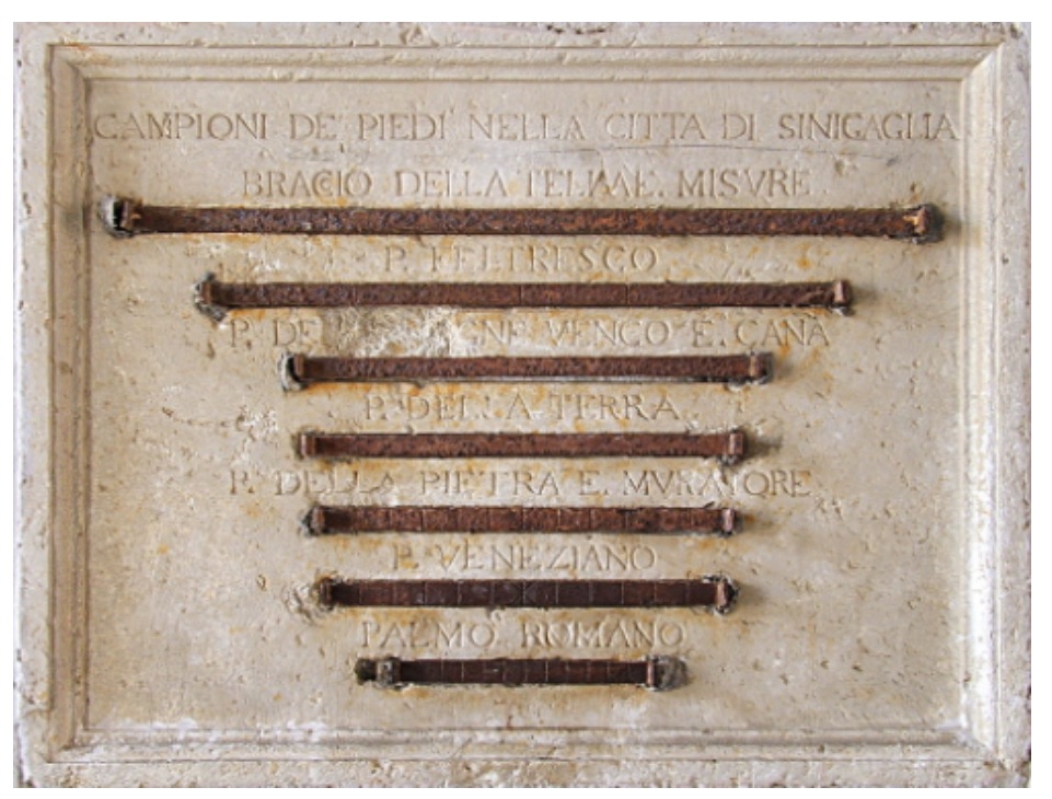 La lastra qui di fianco, proveniente da Senigallia, illustra qual era la situazione prima della unificazione: braccio, piede, palmo, di diverse misure a seconda della provenienza!
