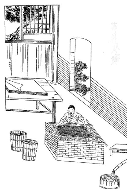 La parte fibrosa della corteccia veniva messa a macerare in acqua, risciacquata e successivamente battuta in mortai di pietra fino ad ottenere una pasta uniforme di fibre cellulosiche. Questa massa di fibre opportunamente diluita con acqua veniva versata sopra la cosìdetta «forma», costituita da una specie di graticcio ottenuto per accostamento di sottilissimi bastoncini di bambù.