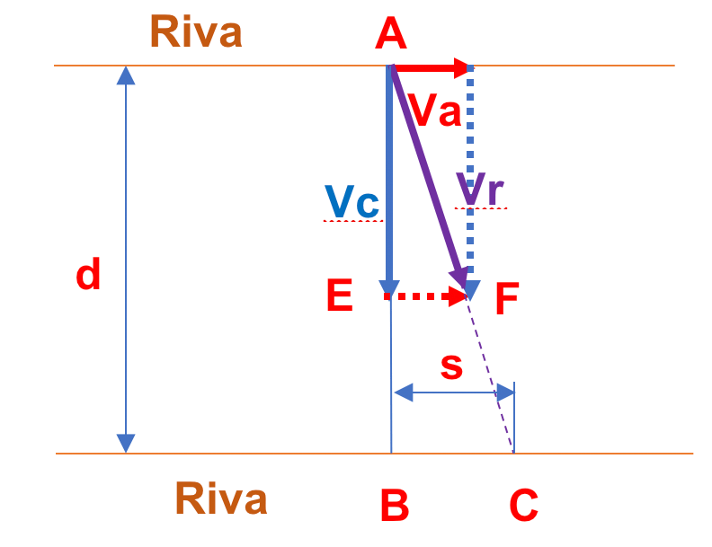 Però, ora torniamo a noi: siccome Vr non è perpendicolare alla riva, quando arriviamo non ci troviamo nel punto B, di fronte ad A da cui siamo partiti: ci troviamo in C. Spostati di quanto? Dipende dalla distanza d tra le rive e dalle velocità Va e Vc.