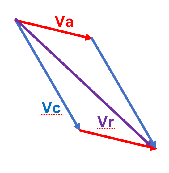 E come si ottiene questa somma? Lo vedete nella figura: la somma Vr delle velocità Va e Vc è la diagonale del rettangolo che ha per lati i due vettori velocità. Avete appena visto come si calcola la somma di due vettori!