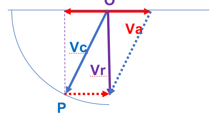 Soluzione: centro nel punto O, disegno un arco di cerchio di raggio Vc. Ora traccio una retta perpendicolare alla riva, a distanza Va da O, ma sul lato opposto. L’arco e la retta s’intersecano in P: la direzione da dare alla canoa è O-P! Difatti, Vc + Va = Vr: ancora la regola del parallelogrammo!