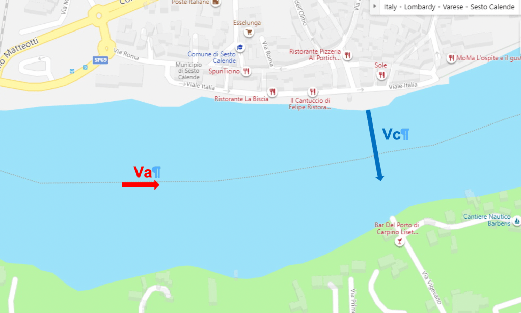Cominciamo con qualcosa di semplice: siamo a Sesto Calende; davanti a noi le acque del Ticino vanno lentamente a valle. Abbiamo con noi una canoa. Primo quesito: se gettiamo un ramo nel fiume, cosa succede? Succede che lo vediamo andare a valle, con la velocità dell’acqua; la chiamo Va.