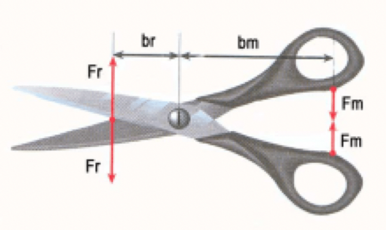 La forbice è una leva del primo genere: il fulcro, la vite, si trova tra la potenza e la resistenza. I primi quattro oggetti che vi ho elencato sono di questo genere: pensateci! La potenza e la resistenza hanno lo stesso verso. La resistenza può essere maggiore o minore della potenza, a secondo della lunghezza dei bracci.