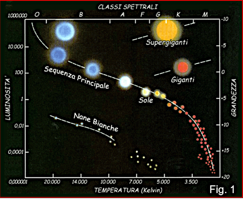 In figura 1 l’asse delle ascisse mostra in basso la temperatura superficiale e in alto la classe spettrale (O,B,A,F,G,K,M). Spesso viene anche utilizzato l’indice di colore B-V perché la sua misura è abbastanza semplice. B-V è definito come differenza tra la magnitudine apparente B misurata con un filtro blu e la magnitudine apparente V misurata con un filtro giallo-verde. Si tratta di un indice diretto della temperatura e quindi del colore della stella: stelle più fredde hanno indice di colore maggiore di stelle più calde.