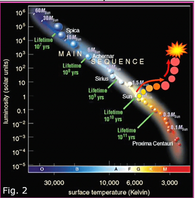 Quando la stella giunge a fine vita si discosta dalla sequenza principale e segue un ramo quasi orizzontale che piega verso destra. Il diagramma di figura 2 mostra, ad esempio, cosa succederà al nostro Sole. Ma allora anche il Sole morirà? Tranquilli, ne riparleremo tra qualche miliardo di anni!