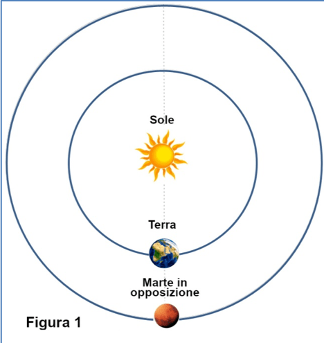 La figura 1 mostra la posizione di Marte in opposizione: si intuisce come questa sia la configurazione in cui la distanza dalla Terra è minima.
