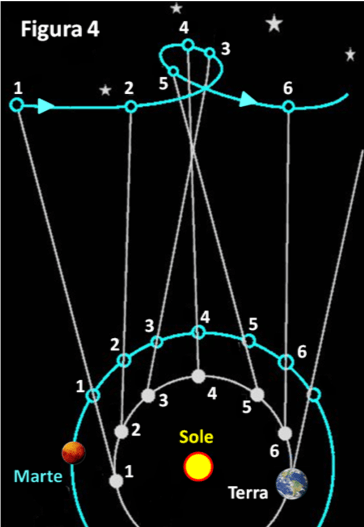 Un aspetto di Marte che ha dato del filo da torcere agli astronomi fin dai tempi antichi è il suo bizzarro moto apparente rispetto alle stelle fisse. Il pianeta, infatti, per un certo periodo procede da est verso ovest (moto diretto), ma poi a un certo punto sembra quasi fermarsi per poi tornare indietro (moto retrogrado) e, infine, procedere di nuovo verso ovest (figura 2).