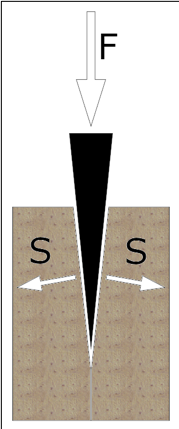 Per scomporre la forza F nelle sue due componenti, è sufficiente tracciare dalle due estremità di F due rette perpendicolari ai due piani del cuneo: i lati S del parallelogramma sono le spinte esercitate dal cuneo contro il legno.