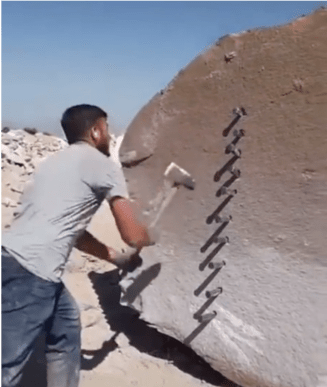 Questa serie di fotografie vi illustra il procedimento. Anzitutto, occorre saper riconoscere nel masso una linea di frattura preferenziale; poi, si inseriscono una serie di cunei lungo questa linea.