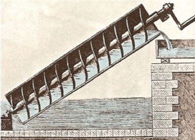 C’è una vite, con la filettatura molto profonda, che gira dentro ad un cilindro: il bordo della filettatura tocca l’interno del cilindro. La parte in basso pesca in un bacino da cui vogliamo sollevare dell’acqua: come fare? È semplice: basta girare la manovella in alto, e l’acqua sale!