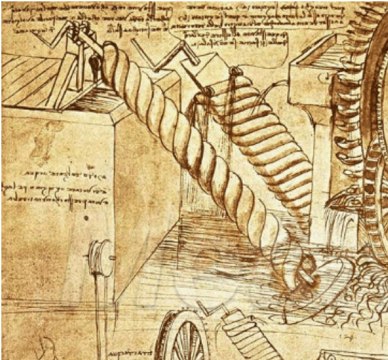 La stessa vite di Archimede si può realizzare avvolgendo un tubo su un cilindro: ecco un disegno tratto dal Codice Atlantico di Leonardo da Vinci. Bene: ci siamo avvicinati; ora siamo a 500 anni fa.