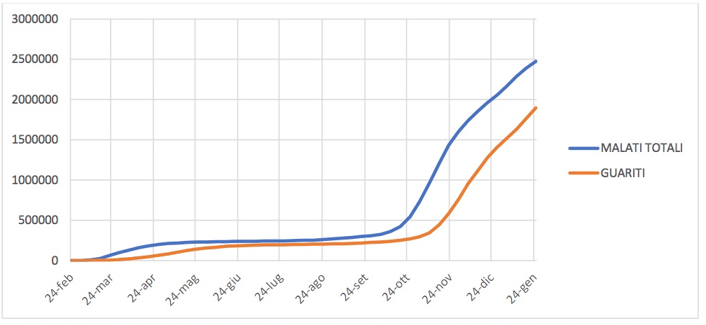 Ultimo dato: le vaccinazioni! Al 30 gennaio 2021 abbiamo raggiunto 1.800.000 prime vaccinazioni e 480.000 richiami. Speriamo che si continui di gran carriera; ad ogni modo, gli operatori sanitari saranno presto tutti vaccinati.