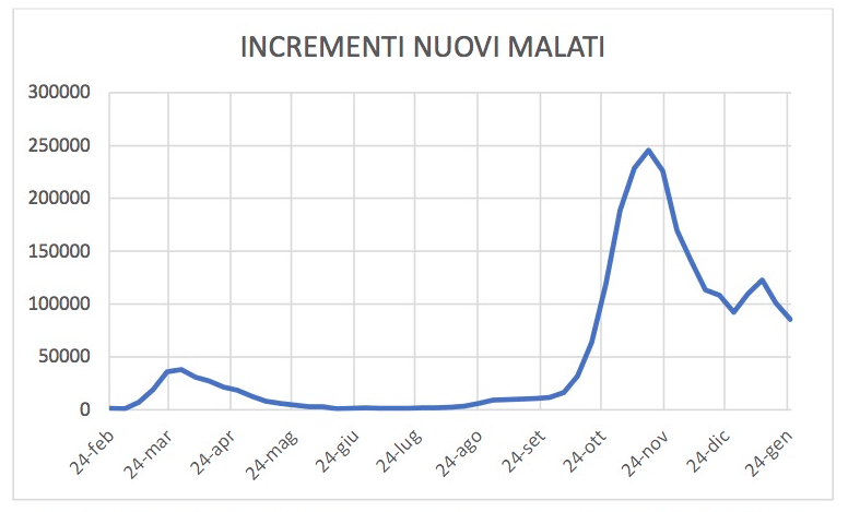 Vedete? Quello che è successo all’inizio della pandemia è pochissima cosa rispetto a ciò che ci è arrivato tra capo e collo in ottobre! Per fortuna, a fine gennaio la curva dei nuovi malati sembra voler scendere: per vederlo meglio, ecco il diagramma degli incrementi dei malati.