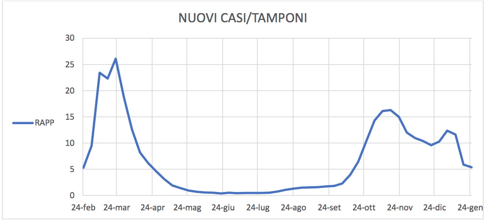 C’è da chiederci se i diagrammi dicono tutta la verità. Voglio dire che i dati sono quelli effettivamente rilevati; però, c’è da chiedersi se il metodo utilizzato per i rilievi sia sempre stato lo stesso. Per capirci qualcosa, esaminiamo il seguente diagramma, che mostra il rapporto percentuale, mediato sulla settimana, tra i nuovi malati ed i tamponi eseguiti.