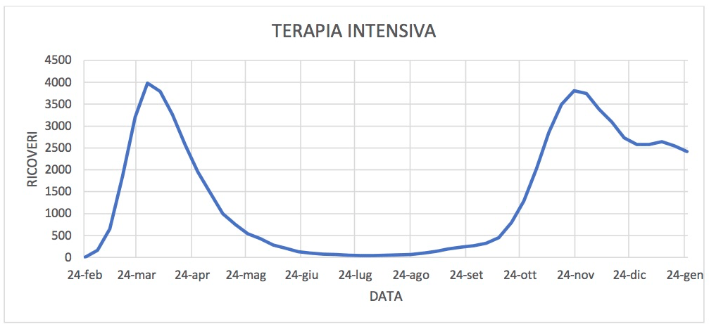 Si vede anche che, a fine gennaio, l’andamento attuale della terapia intensiva è favorevole: questo fatto, assieme alla riduzione del numero dei nuovi malati, è la risposta alle misure prese e dal nostro ragionevole comportamento.