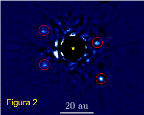 La figura 2 mostra quattro pianeti che orbitano intorno alla stella HR 8799, che dista da noi “solo” 129 anni luce. Si tratta di un’immagine altamente spettacolare, ripresa dal telescopio Keck alle Hawaii il 21 luglio 2016. Per ottenerla, è stato necessario occultare la stella centrale, mediante uno strumento chiamato coronografo: solo in questo modo si riesce a vedere la debole luce irradiata dai pianeti, che, altrimenti, sarebbe completamente sovrastata dalla luce dell’astro.