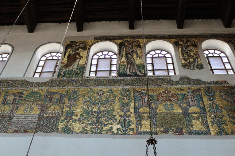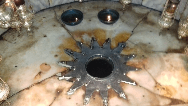 La Basilica della Natività, voluta dall’imperatore romano Costantino nel 326 d.C. è la chiesa più antica rimasta sempre in funzione dal tempo della sua costruzione. L’angusto pertugio, attraverso il quale entrarvi, è talmente basso che è necessario chinare il capo e ciò ha portato a pensare che quello fosse un, quantunque forzato, gesto di umiltà, da cui quella porta prende il nome. Pochi, tuttavia, ricordano volentieri che in tal modo si offre il collo a chi, stando ben preparato e protetto al suo interno, una volta quel collo poteva mozzarlo con un colpo di spada, se riteneva che l’ospite fosse ostile. La Basilica è greco-ortodossa e i suoi mosaici pavimentali, originali, sono di grande pregio, sia storico che artistico. Quelli alle pareti, in parte danneggiati, sono stati magistralmente restaurati in anni recenti da esperti provenienti da due scuole di restauro italiane, quella di Ravenna e quella di Prato. Ora si possono ammirare per lo splendore dei loro colori accesi che brillano alla luce naturale, proveniente dai finestroni posti in alto sulle pareti laterali. È quasi scontato dover fare una lunga fila per accedere alla grotta posta sotto l’altare maggiore. Difficilmente ci si impiega meno di un’ora in una calca crescente fino al parossismo, a mano a mano che ci si avvicina allo stretto ingresso al sito. Nell’attesa c’è chi prega in solitudine o in gruppo, chi parla, sfoglia brochures, guide turistiche o chiacchiera, o tutte quante queste cose insieme, come nessuna di esse. Poi tutto accade in fretta, in modo convulso. Mentre si transita dentro la grotta della Natività si è presi dall’ansia di dover fare quante più cose possibile nei pochi secondi concessi: una preghiera, un inchino, una carezza, o, riuscendoci perfino un bacio, alla “stella” a quattordici punte[1] dove il neonato Gesù fu adagiato, una candela da accendere accanto alla mangiatoia e, una – anzi diverse – foto, meglio se in posa. Davvero troppe cose tutte insieme. Una volta ho visto religiosi che pregavano e allo stesso tempo mangiavano un pezzo di pane… (o, forse, mangiavano un pezzo di pane, mentre pregavano…).