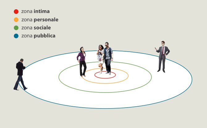 L’antropologo statunitense Edward T. Hall ha individuato quattro zone ben specifiche che vengono solitamente occupate in modo diverso a secondo di condizioni ben specifiche che si hanno quando comunichiamo. Gli studi di Hall hanno permesso anche di misurare queste zone.
