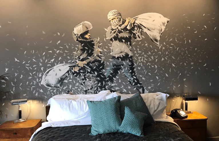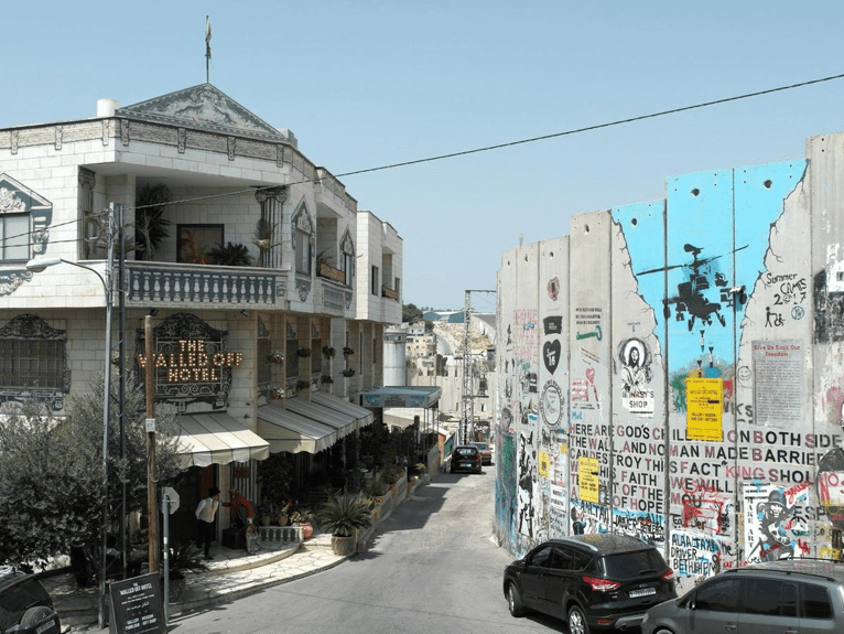 Camminando lungo il muro, si notano diversi graffiti, alcuni di Bansky, uno dei più importanti esponenti della street art del mondo. Ma il luogo più curioso è proprio “the Walled off hotel” (l’albergo murato), un piccolo albergo posto di fronte al muro di separazione, che contiene decine di opere proprio di Bansky. Alcune di esse si trovano nelle sue dieci camere; altre, invece, sono nella hall e sono liberamente accessibili ai visitatori esterni.