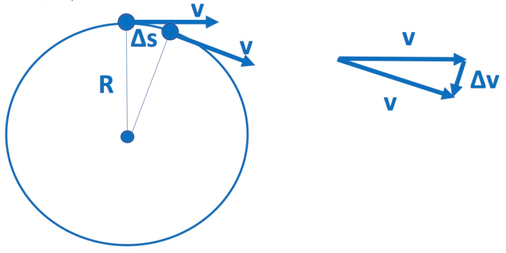 Abbiamo un oggetto, ad esempio il martello, che viaggia di moto circolare uniforme con velocità v. Ad ogni momento l’oggetto cambia direzione: nell’intervallo di tempo Δt si sposta di un arco di cerchio Δs = v ∙ Δt