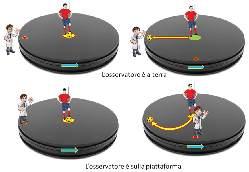Allora: saliamo nuovamente sulla giostra, ci mettiamo sul suo asse, e, mentre la giostra gira, lanciamo un pallone ad un nostro amico che si trova a terra e che, al momento del lancio, sta di fronte ad un puntino rosso disegnato sulla giostra. Cosa succede?