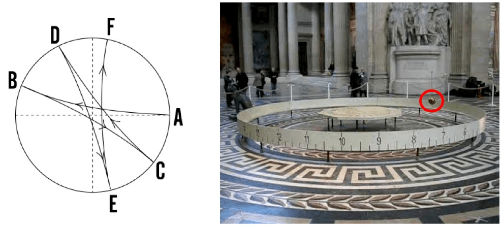 A destra vedete il pendolo realizzato da Foucault, ed installato nel Pantheon di Parigi: la sfera è cerchiata in rosso. Il cavo è lungo 68 m; la massa è 28 kg. Una punta in basso traccia un lieve segno sulla sabbia posta nella parte centrale sopraelevata: per vedere il movimento, occorre del tempo. Quanto tempo?