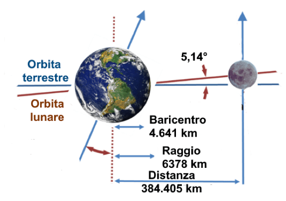 Succede che, date le masse della Terra e della Luna e le loro distanze, il baricentro del sistema si trova a 4641 km dal centro della Terra, (quindi, dentro alla Terra), e che entrambi, sia la Terra che la Luna, girano attorno al baricentro, percorrendo un giro completo nei 28 giorni della rivoluzione lunare! Scommetto che non lo sapevate. Ma allora, se le cose stanno così, sulla Terra si sviluppa una reazione centrifuga a questa rotazione!