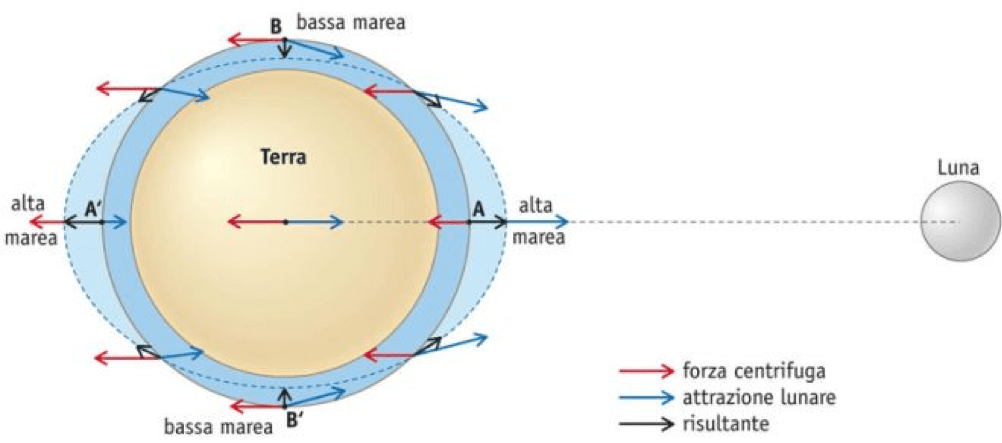 Normalmente si rappresenta la Terra come un punto, situato al suo centro. Però la Terra non è un punto: con un raggio di circa 6.370 km (pari a 6,37 ∙ 106 m), ha una certa estensione. Di conseguenza, il valore dell’attrazione gravitazionale lunare cambia un poco lungo la sua superficie: è massima nel punto più vicino alla Luna; minima nel punto più lontano.