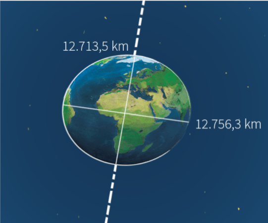 L’equatore misura 12.756 km; il meridiano invece misura 12.713 km. Newton aveva capito questo fatto; però, secondo Cartesio la forma doveva essere opposta, tipo un’anguria, allungata sull’asse di rotazione.