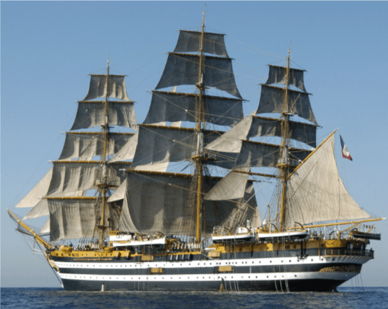 La risposta dipende dalla distribuzione dei pesi; pensando alle navi a vela: scafo, alberature, vele! Ecco la nostra bellissima Nave Amerigo Vespucci, con tutte le vele spiegate.