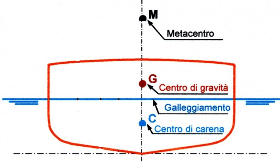 - C, indicato come centro di carena, cioè baricentro della parte della nave immersa nell’acqua;