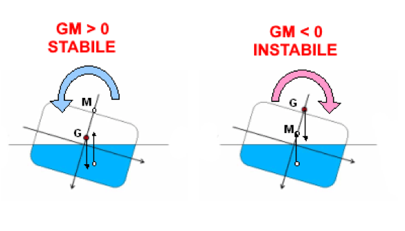 Se chiamiamo GM il segmento che va da G ad M, nel primo caso della figura l’azione della coppia delle forze, pari al peso della nave, fa raddrizzare la nave, che è stabile.