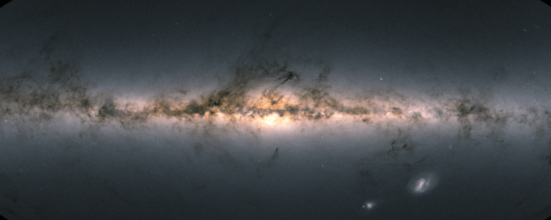 L’immagine della Via Lattea riprodotta dalla figura riassume visivamente l’enorme lavoro di Gaia: tutti gli oggetti esaminati dal satellite sono collocati nella posizione rilevata e formano una mappa di forma ellittica che rappresenta la volta celeste in due dimensioni (proiezione di Hammer), come avviene con i planisferi che raffigurano la Terra.