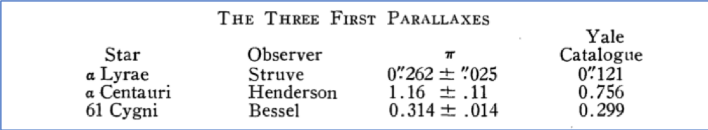 Negli stessi anni Friedrich G. W. von Struve misurò la parallasse della stella Vega (0,262”) e Thomas Hendersonquella di Alfa Centauri (1,16”). I valori risultarono di poco superiori a quelli che oggi conosciamo.