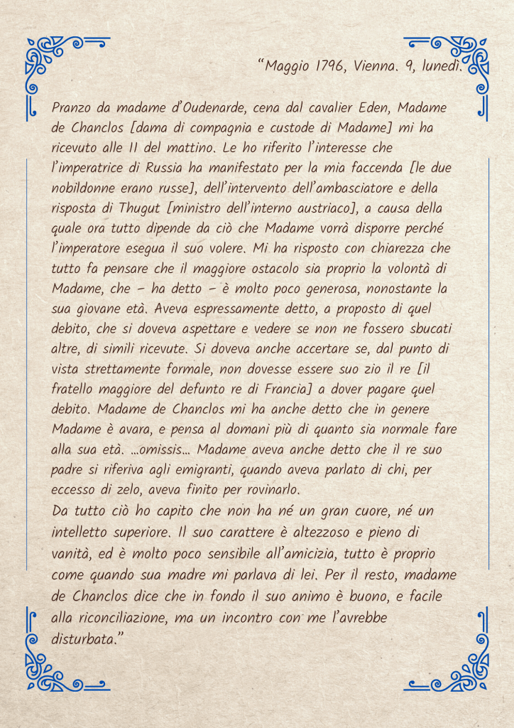 Nell’inverno 17895-1796, il conte Fersen si era recato a Vienna in occasione dell’imminente liberazione della figlia del re di Francia. Il motivo principale della visita non era né la curiosità di vedere la prigioniera, ancora adolescente, né di renderle onore. In realtà, il fine di Fersen era quello di riscuotere una ingente somma di denaro che lui e due nobildonne avevano anticipato al defunto re di Francia, per organizzare la fallita fuga di Varennes. Del credito il conte conservava la ricevuta, firmata dal re e dalla regina defunti, che riteneva avere il valore di un impegno morale per l’imperatore d’Austria e per Madame Royale [l’uno nipote, l’altra figlia di Marie Antoinette]. Non era così, e sprecò il suo tempo, esponendosi all’umiliazione di essere un questuante fra tanti, senza ottenere il denaro anticipato. In questo frangente l’imperatore iniziò una serie di manovre a scaricabarile, implicando il volere della nipote, peraltro minorenne. Una umiliante storia di scarico di responsabilità, che sembra ripetersi con caratteri invariabili fino ai nostri giorni. Madame Royale rivelò il suo vero carattere di adolescente cresciuta in un ambiente violento e insicuro.