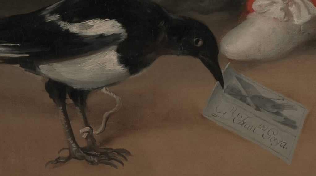 Un altro simbolo presente e di facile identificazione è rappresentato dalla gazza ladra, che nell’Arte è spesso associata al presagio di morte imminente. Riflettendo sul suo significato in relazione al ritratto, ci si rende conto che il volatile in questione non ha ragion d’essere visto che il bambino era già morto. Se osserviamo con attenzione il biglietto che la gazza ladra ha nel becco possiamo leggere la firma del pittore “D.n Frac.co Goya.” [Don Francisco Goya]. Grazie a questo dettaglio possiamo interpretare il simbolo nel modo più corretto, che è anche in perfetta sintonia con la visione di Goya stesso: l’ineluttabilità del destino alla quale nessuno è immune.
