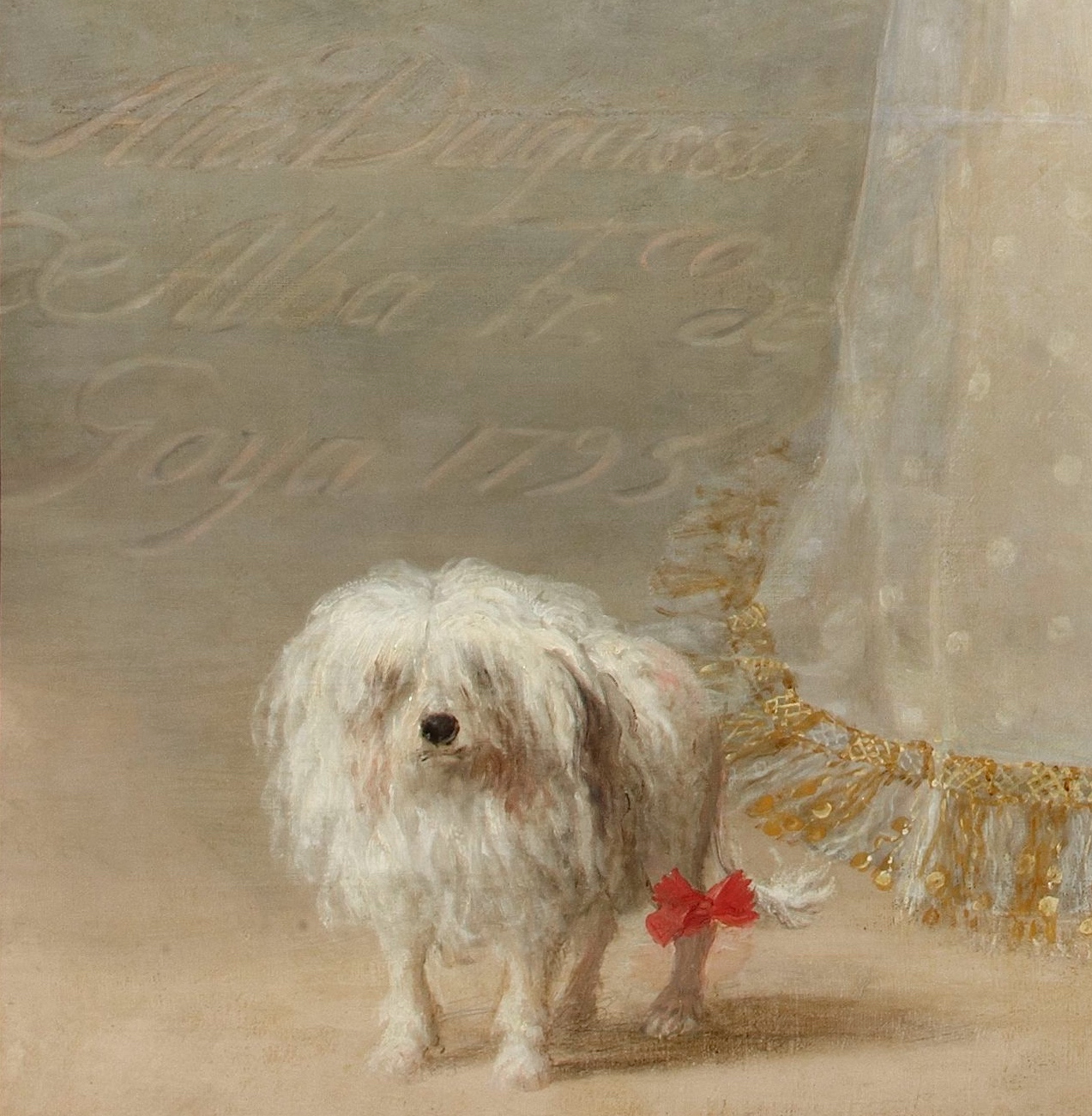 Nelle Arti, e più in generale nella tradizione comune, il cane è simbolo di fedeltà. In questo ritratto, per la posizione e per una scelta ben precisa del pittore, può avere una doppia interpretazione. Potrebbe essere presente in qualità di simbolo, non tanto legato alla duchessa e ad un’ipotetica fedeltà coniugale (si sa che non era una caratteristica della donna in questione e per galanteria è meglio non investigare troppo) ma è più probabilmente da riferirsi a Goya stesso, che ha deciso di apporre la sua firma proprio sopra l’animale. Sembra quasi che il pittore abbia voluto esprimere la sua fedeltà nei confronti di questa donna, che l’ha così tanto stregato e ammaliato.