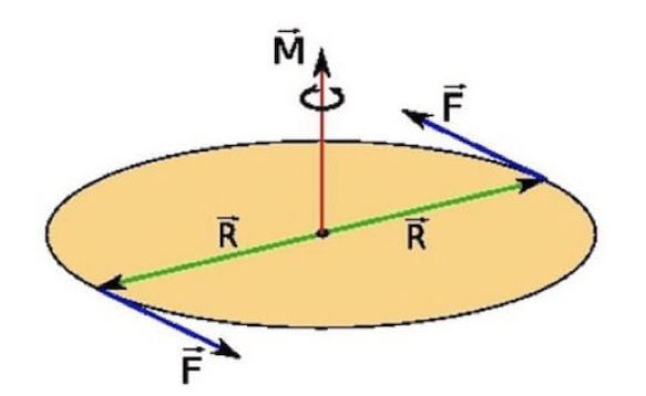 Vi ricorderete che abbiamo parlato del momento di una forza su una leva; ebbene, nel caso di una coppia di forze F, come quella in figura, il momento è il prodotto della forza per la distanza: nel caso della figura, M = F ˄ 2R.