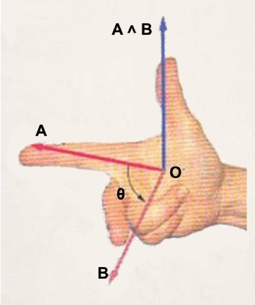 - Per il prodotto vettoriale, dati due vettori A e B, chiamando A e B i loro moduli, e θ l’angolo tra di loro, il prodotto vettoriale P è un vettore. Il prodotto vettoriale si indica con il simbolo ˄: si scrive P= A ˄ B, e si legge: “a vettore b”. Il modulo di P vale: P = A ∙ B ∙ sin(θ); la direzione di P è l’asse ortogonale al piano che contiene i due vettori A e B; il verso di P è quello di avanzamento di una vite destrorsa che gira da A verso B. Di nuovo, non cadete dalla sedia: per il verso si può usare quella che si chiama regola della mano destra (ah, questi matematici!).