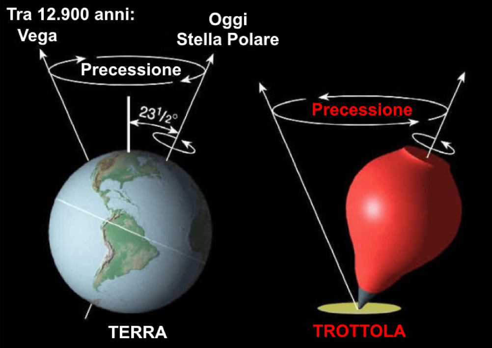 Abbiamo pure detto che la Terra è anche lei una trottola, con velocità di rotazione piccola rispetto ad una trottola, ma con massa enorme: oltre alla rotazione attorno al suo asse, ha anche un movimento di precessione, che dura in tutto 25.800 anni. La conseguenza è che, mentre oggi l’asse di rotazione terrestre passa per la stella Polare, ai tempi di Cesare era alquanto spostato; tra 12.900 anni, l’asse sarà allineato con Vega, che diventerà la nuova stella polare!