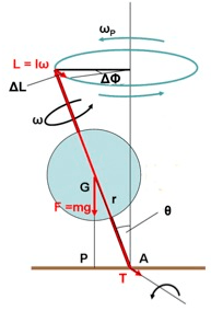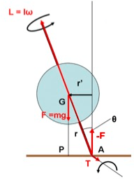 Quando la trottola è ortogonale al piano d’appoggio il suo peso passa per A. Se la trottola s’inclina, di un angolo θ, il suo peso F = m ∙ g, assieme alla reazione (terzo principio!) – F, forma una coppia con braccio r’, a cui corrisponde il momento T = F ˄ r’, che tende a far ruotare la trottola nel senso indicato dalla freccia. Come detto nell’articolo precedente, T è ortogonale sia a F che a r’; quindi, è anche ortogonale a L.