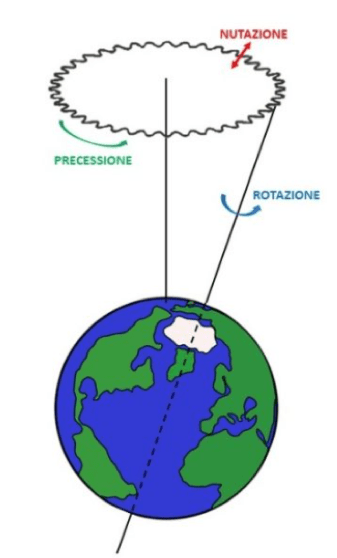 Ebbene, sia sulla trottola che sulla Terra esiste un altro moto oltre a quello di precessione: il movimento di nutazione. Questo movimento, scoperto da James Bradley nel 1768, è una leggera oscillazione dell’asse di rotazione della Terra (o della trottola). Nella trottola, la nutazione è causata dal fatto che il momento angolare della rotazione, che è il fenomeno principale, si somma al (piccolo, ma non nullo) momento angolare della precessione! Sulla Terra, invece, la nutazione è causata dalle forze di marea del Sole e della Luna; il movimento risultante è illustrato nella figura. Rispetto al piano dell’eclittica, la precessione procede in senso orario, mentre la nutazione procede in senso antiorario. La regola è la stessa della trottola; però, per la Terra, la forza che agisce tende a raddrizzarla; cioè, a portare l’asse di rotazione terrestre ortogonale rispetto al piano dell’eclittica.