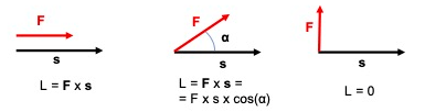 Anzitutto, diamo allo spostamento una direzione ed un verso: a questo modo diventa un vettore. Ciò premesso, il lavoro L è il prodotto scalare (ricordate?) dei due vettori, forza e spostamento. Nella figura sono illustrati tre casi: F ed s paralleli, inclinati dell’angolo α ed ortogonali. La formula generale è quella al centro: