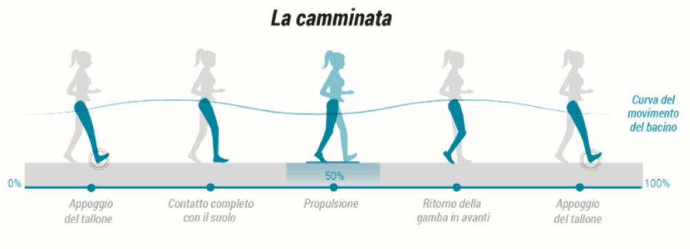Il disegno illustra il fatto che, mentre camminiamo, il nostro bacino continua ad abbassarsi e sollevarsi, circa del 15% della nostra altezza. Quindi, camminando, ad ogni passo compiamo un lavoro pari a 0,15 x (altezza) x (peso, in N). Se siete alti 1,7 m e pesate 60 kg, ad ogni passo il lavoro è L = 0,15 x 1,7 x 60 x 9,8 = 150 J!