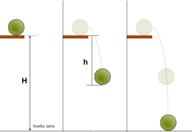 Quindi, l’energia potenziale si trasforma man mano in energia cinetica. Se, sul terreno, la sfera trovasse una molla ideale, trasformerebbe la sua energia cinetica in energia di compressione della molla, la quale farebbe rimbalzare la sfera sino all’altezza H!