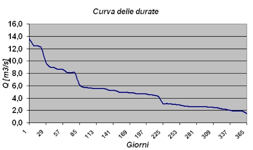 In effetti, noi conosciamo la portata Q del fiume che alimenta la diga; per essere più precisi, conosciamo il profilo della portata del fiume, con la sua variabilità nell’anno. È chiaro che se dimensioniamo l’impianto sulla portata massima avremo disponibile la potenza massima solo alcuni giorni all’anno: e gli altri giorni? Ecco, ad esempio, la curva della portata di un fiume e dei giorni in cui è disponibile quella portata.