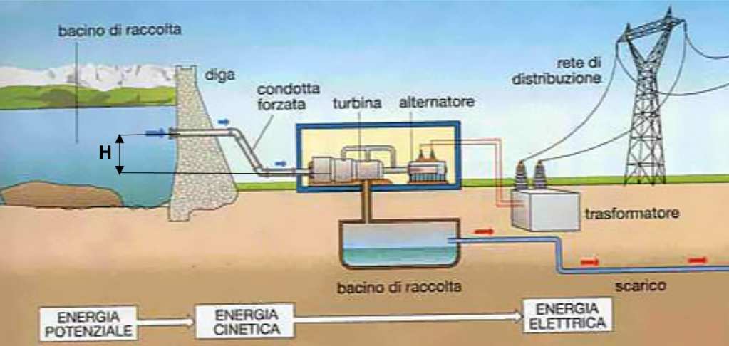 Iniziamo, a sinistra, con un lago, formato dalle acque trattenute da una diga: l’acqua ha una energia potenziale, che dipende dal dislivello H rispetto alla turbina. L’acqua del lago esce attraverso una tubazione molto robusta, che si chiama “condotta forzata”. L’acqua segue la condotta sino a quando arriva ad una turbina: un dispositivo che, molto meglio della ruota del mulino, trasforma l’energia cinetica dell’acqua nella rotazione di un asse. Questo asse è collegato rigidamente a quello di un dispositivo elettrico, l’alternatore, che trasforma l’energia meccanica in energia elettrica. La tensione generata dall’alternatore è opportunamente cambiata di valore dal trasformatore, e poi portata alla linea di distribuzione. Vedremo in futuro come si genera l’energia elettrica; per ora fermiamoci alla meccanica.