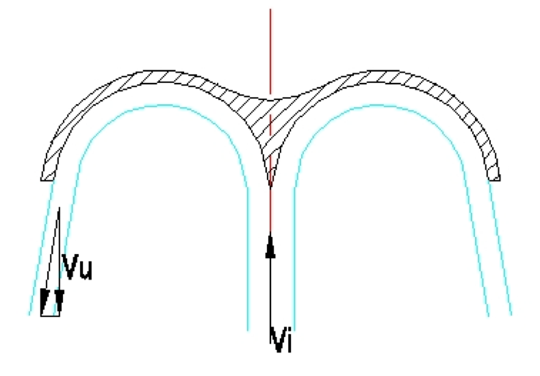 Di sotto, ecco lo schema dei cucchiai: l’acqua arriva con velocità vi, urta la rotante, e cede quasi completamente la sua energia: la velocità di uscita vu è quasi eguale ed opposta a vi, tranne la piccola componente laterale, indispensabile per allontanare l’acqua dalla turbina. Chiaro?