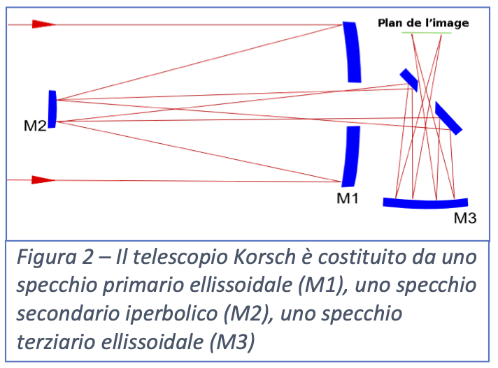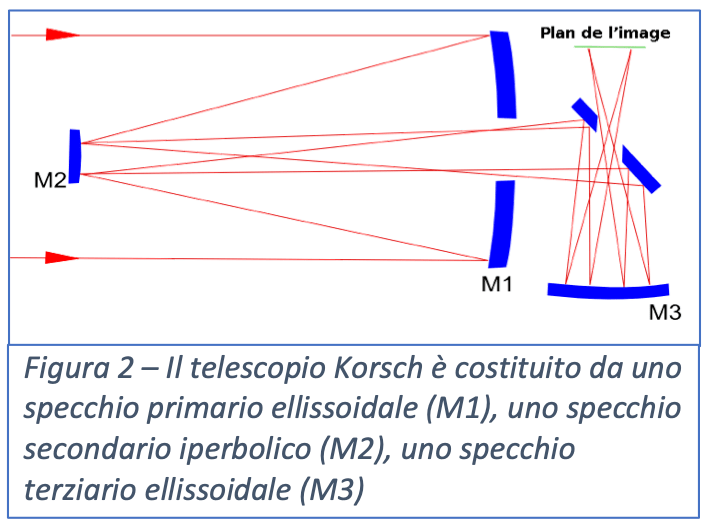 Lanciato con una razzo Falcon 9 di Space X (l’azienda di Elon Musk), Euclid è dotato di un telescopio Korsch (anastigmatico a tre specchi) e copre le lunghezze d’onda dello spettro elettromagnetico che vanno dalla luce visibile al vicino infrarosso. È munito di uno specchio del diametro di 1,2 metri (M1 in fig.2) ed è stato posto in orbita attorno al punto lagrangiano L2 del sistema Sole-Terra ad una distanza di circa 1,5 milioni di Km.